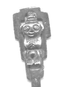 An unusual set of nice quality handmade demitasse spoons in the art deco style. I believe that the stepped design is a reference to the Mayan pyramids at Teotihuacan which is just outside Mexico City. The Mayan stone god image is applied to the spoon. The spoons are unmarked, but I suspect that they are sterling quality. I also suspect that the spoons are from Mexico, but it is also possible that they are from Central America