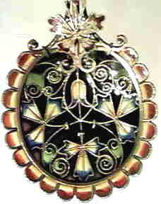 But in PLIQUE-A-JOUR there is no backing to the enamel. The cells must be kept small and the enamel is applied between the open cells and held in place by surface tension or a mica backing plate. After firing, the enamel becomes hardened and permanently attached to the sides. This is a very difficult process for even the most skilled artisans.