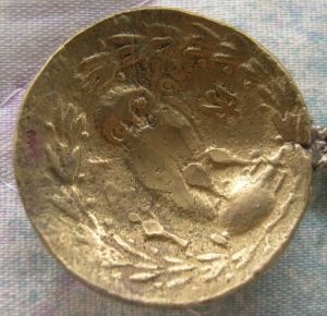 In this spoon , the bowl has been formed from an ancient coin (not yet identified - -help please)