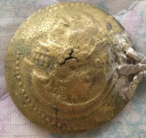 This is the front and back of this coin. As you can see the stress from making the bowl shape caused the old metal to crack.