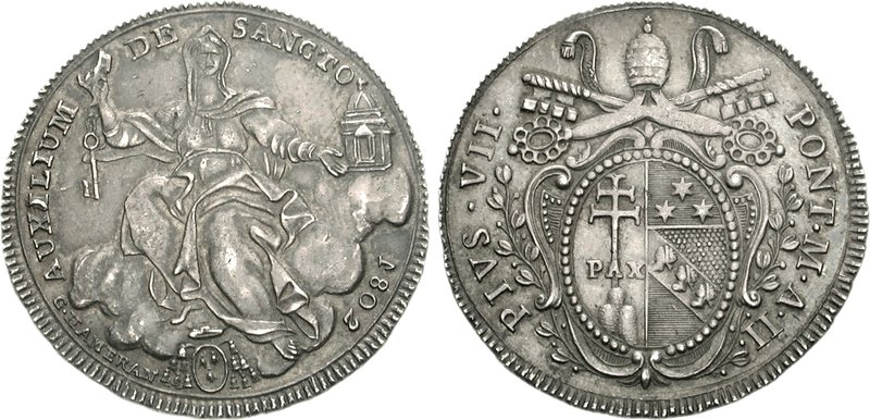 Crowned coat-of-arms surmounted by crossed keys. PIVS VII PONT MAX