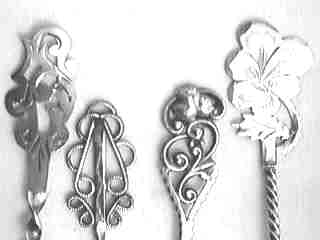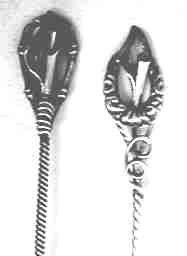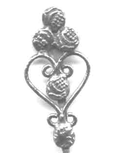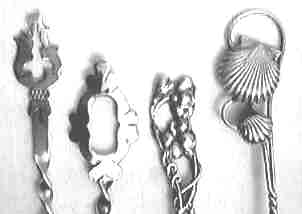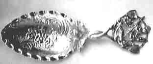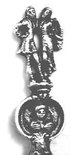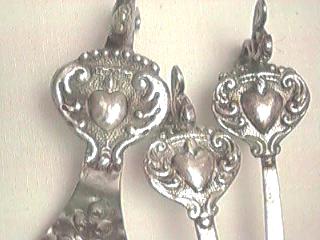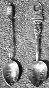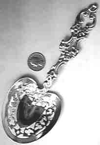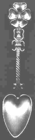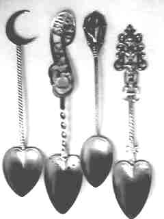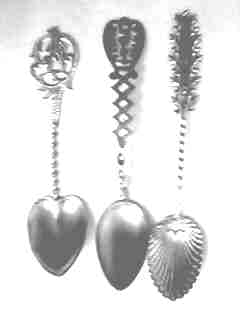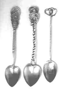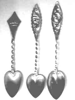 The tradition of giving a spoon to one's lover is very old. The Welsh and Norwegians have museums of old carved wooden spoons which young men would create as presents for the young ladies which they were courting. Reproductions of these old wooden spoons are readily available. But since this is a sterling silver spoon page, I felt obligated to show only silver spoons in the love "genre". Although these spoons were probably not made by the young man they are obvious derivatives of that tradition.