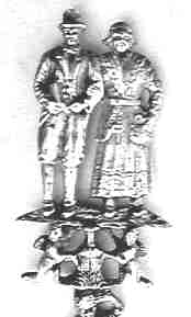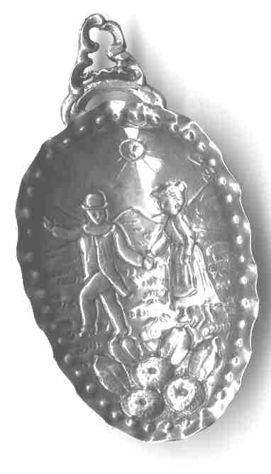 Dutch spoon from the 1860 -70 time period. The bowl shows a picture of "ladies-in-waiting" taking care of the bride-to-be. The finial is St. George slaying the dragon (closeup can be seen on the dragon page)