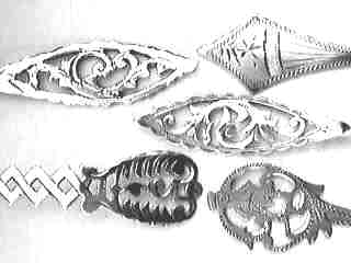These spoons are similar to the love spoons above, except they have conventional looking bowls instead of heart shaped bowls. Many were given to "sweethearts", but others may be engraved with a city name, or have another design element in the bowl.