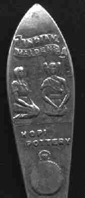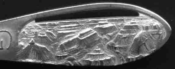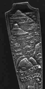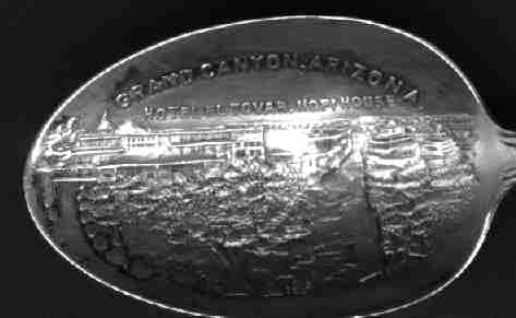 This classic Grand Canyon Spoon features a papoose at the top, a covered wagon and indian tools. The bowl features the El Tovar Hotel and a view of the canyon. The view of the canyon from the area behind this hotel is awe inspiring.