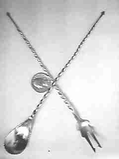 These spoons are usually about 8.5" - 9" (215 - 230mm) long, have pierced bowls, twisty handles and a barbed end which was used to spear the olive. Since olives were usually stored in a brine, the bowl end had holes so that the brine could drain out.