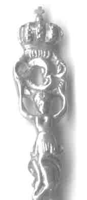 This is a neat 7.6" bon bon spoon from Holland. At the top we have a bare breasted mermaid holding aloft a kings crown (the mark near her left hand is one of two purity marks). In the hand cutout and engraved bowl we have a cat on the left and a bird on the right (enlarged--and the strange color shift is where I tried to lighten up the cat so you could see it better). 800 silver