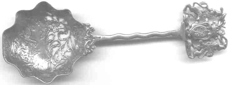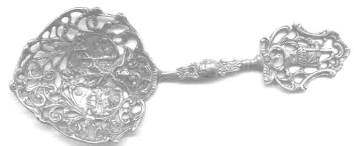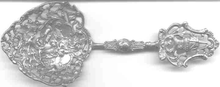 These spoons feature open work designs. Sometimes spoons of this type are cast and other times the work is created by hand sawn cutouts. The spoons on this page measure between 5 and 7 inches in length. The bonbon server page shows some very large and impressive bon bon servers.