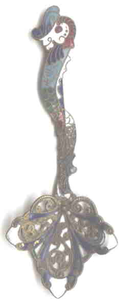 This is a cute whimsical enameled seahorse bon bon spoon. It appears to be made of a gold colored metal, but there are no marks of any kind. I doubt that it is silver. I have also seen various spoons of a similar style. I suspect that it was made in the 1900's.