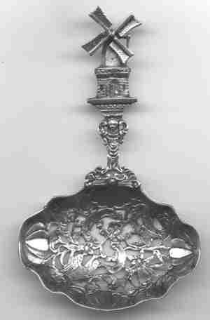 Bon bon spoon with a windmill finial (movable vanes) and a very deep open work bowl. The bowl is similar to those shown under the bonbon love spoons, but this spoon only has flower and vine designs