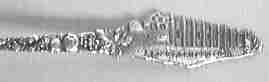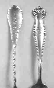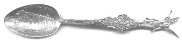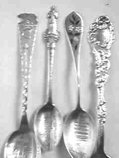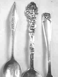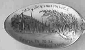 Because the San Gabriel mission (1771) is so close to Los Angeles, it received many visitors, consequently we find a number of spoons from this mission. The spoon with the bear finial refers to it as the "Los Angeles Mission". The third spoon from the left with the flowers is enameled, but the picture was converted to B&W