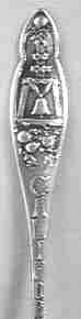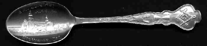 Engraved view of Mission San Luis Rey in Oceanside, California. The handle on this spoon contains Mason symbolism (unusual combination). I recently visited this mission and it has been completely restored.