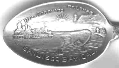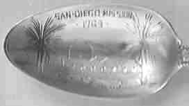 A nice souvenir spoon featuring a skyline view of the San Diego mission. The bowl has an unusual San Diego setting sun harbor scene.
