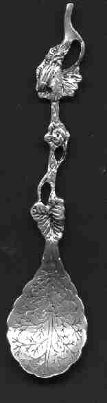 I am unsure of the use of this very unusual hand made serving piece in the trailing vine pattern. The marks indicate that it was made by Henry Andrews of Boston, Mass. in the 1830's. I like the quality of the chasing in the handle and I also thought that the engraving in the bowl was rather unusual.