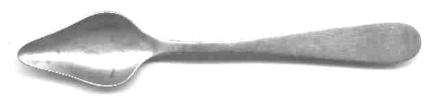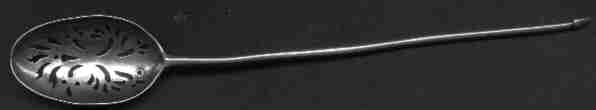 The mote spoon (5.75" 146mm) is an unusual piece with a pointed edge which was designed to clear the tea pot when tea leaves blocked the opening screen. The spoon bowl was designed to remove the small floating pieces of tea leaf or foreign matter (motes) that might be found in the cup. The spoons can sometimes be dated by the shape of the perforations in the bowl.