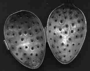 The bowl is hinged and tea leaves were placed in the bowl which would