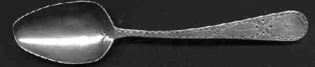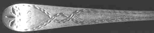 This is an example of "old english" bright cut engraving dated to 1788 by the marks. As you can see from the picture, this spoon has seen substantial use (note the bowl has been worn down). Silver was very expensive at this time, and it was not unusual to use a piece over and over again. Sometimes it pays to look into piles of "junk" spoons. I was able to buy this very old spoon for the whopping sum of $4.00 (not too bad for a 200+ year old antique--even if it is not in primo condition).