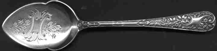 A large spoon in this style. I have not been able to trace the marks on this serving spoon. Spoons in this style were made thru the 1890's