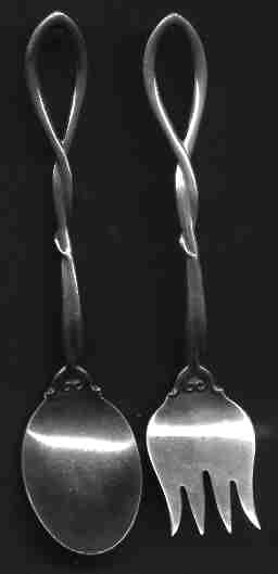 This spoon and fork set are reproductions of a very rare mid eighteenth century English pattern called "whip" or "whiplash". This set was handmade in sterling silver by the American firm of Frank M. Whiting (1878 - 1896)